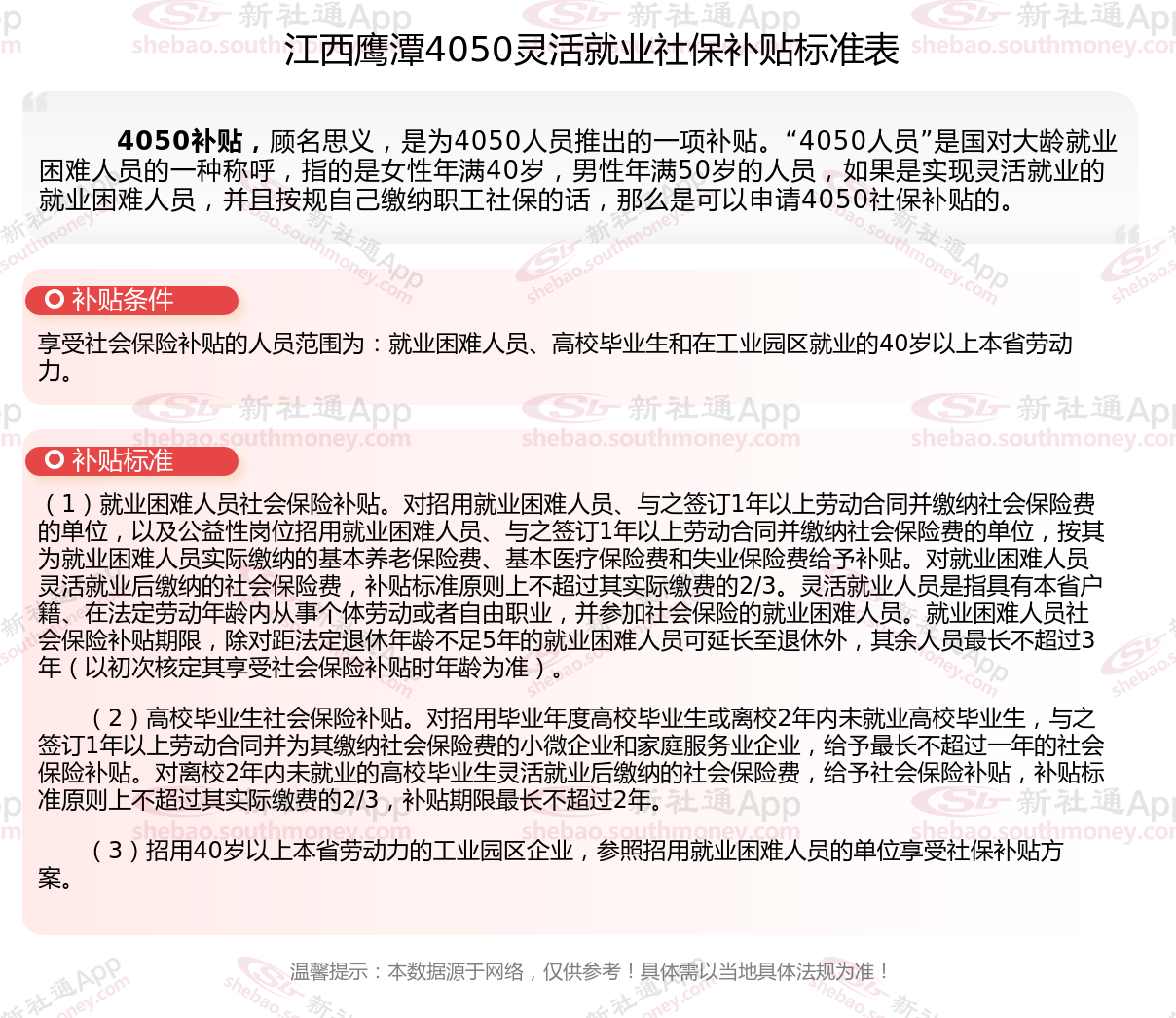 二、2025年江西鹰潭4050社保补贴标准是多少?条件是什么?