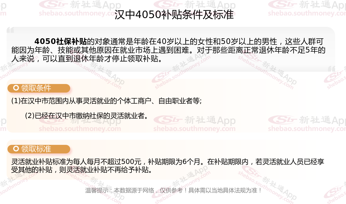 二、2025年汉中4050社保补贴标准是多少?领取条件是什么?