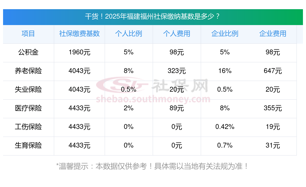 2025年福建福州社保缴费多少钱?下表是2023-2024年福建福州社保费用明细参考,如下: