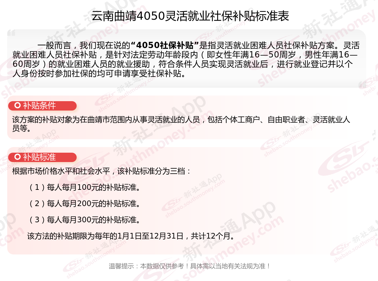 云南曲靖4050社保补贴多少钱一个月?云南曲靖4050社保补贴2025年最新标准是多少?2025云南曲靖4050补贴主要针对的是年龄在40岁以上的女性和50岁以上的男性,这些人群通常因为年龄较大而面临就业困难。
