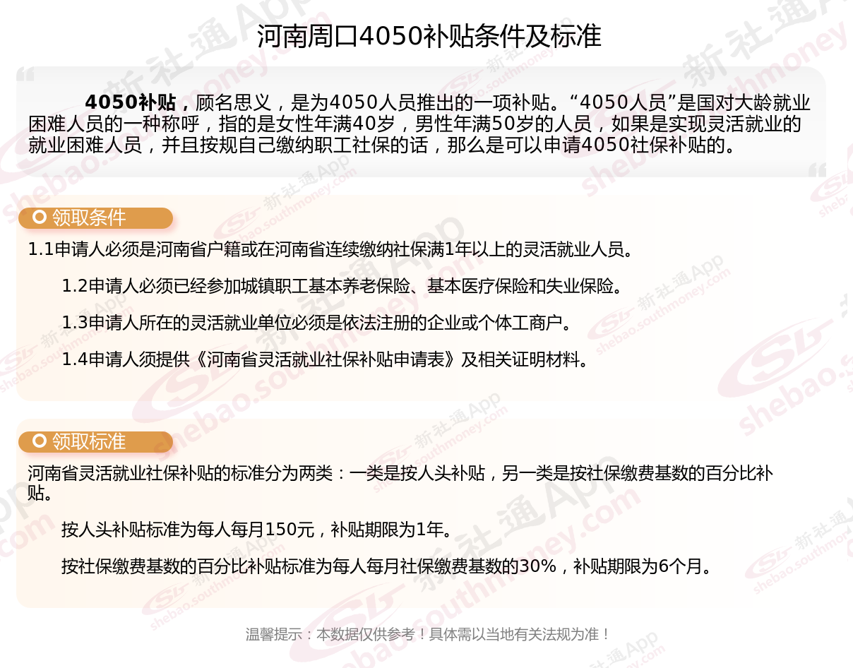 一、2023-2024年河南周口4050社保补贴标准及条件是多少?
