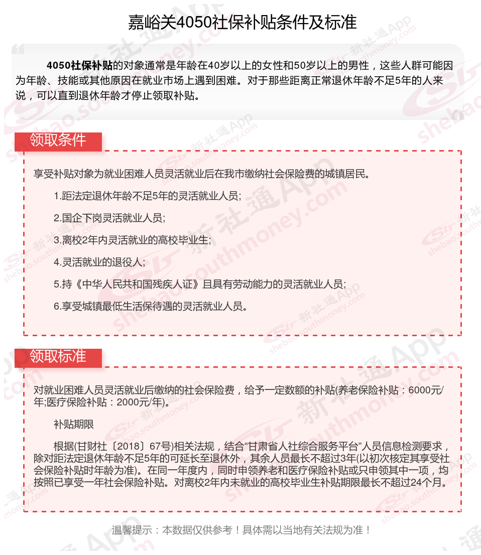 一、2023-2024年嘉峪关4050社保补贴标准及条件,最新如下