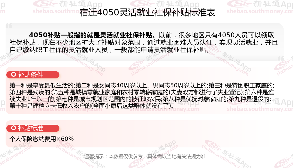 2025年宿迁4050社保补贴新规 2025年宿迁4050社保补贴标准及条件是什么?2025宿迁4050补贴主要针对的是年龄在40岁以上的女性和50岁以上的男性,这些人群通常因为年龄较大而面临就业困难。