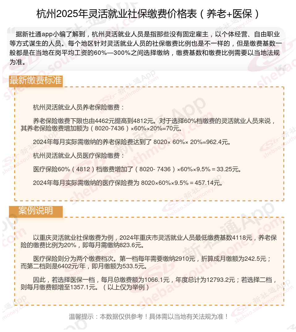 灵活就业社保通常只需缴纳养老和医疗两项(部分地区可自愿选缴失业险),其他险种无需强制缴纳。灵活就业社保缴费满15年后,退休后可领取养老金,避免老年无收入来源。那么2025年杭州灵活就业人员社保需要交多少钱?下面随新社通小编一起来看看。