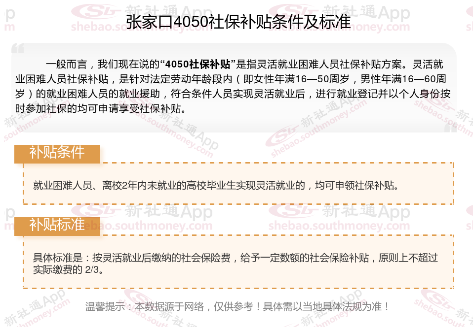 2025张家口灵活就业4050社保补贴是一项面向特定年龄段的就业困难人群的社会保险补贴。