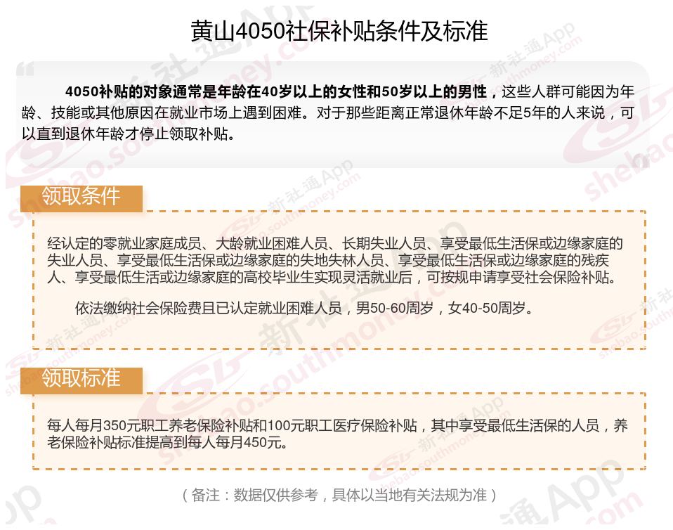 今天聊一下4050补贴话题。4050补贴听起来像是一个针对特定年龄人群的社保补贴。比如女性需年满40周岁,男性需年满50周岁(以申请当年12月31日为截止日期)。那么黄山4050灵活就业社保补贴标准是多少钱?黄山4050社保补贴条件是什么?接下来随新社通APP小编了解一下最新资讯。