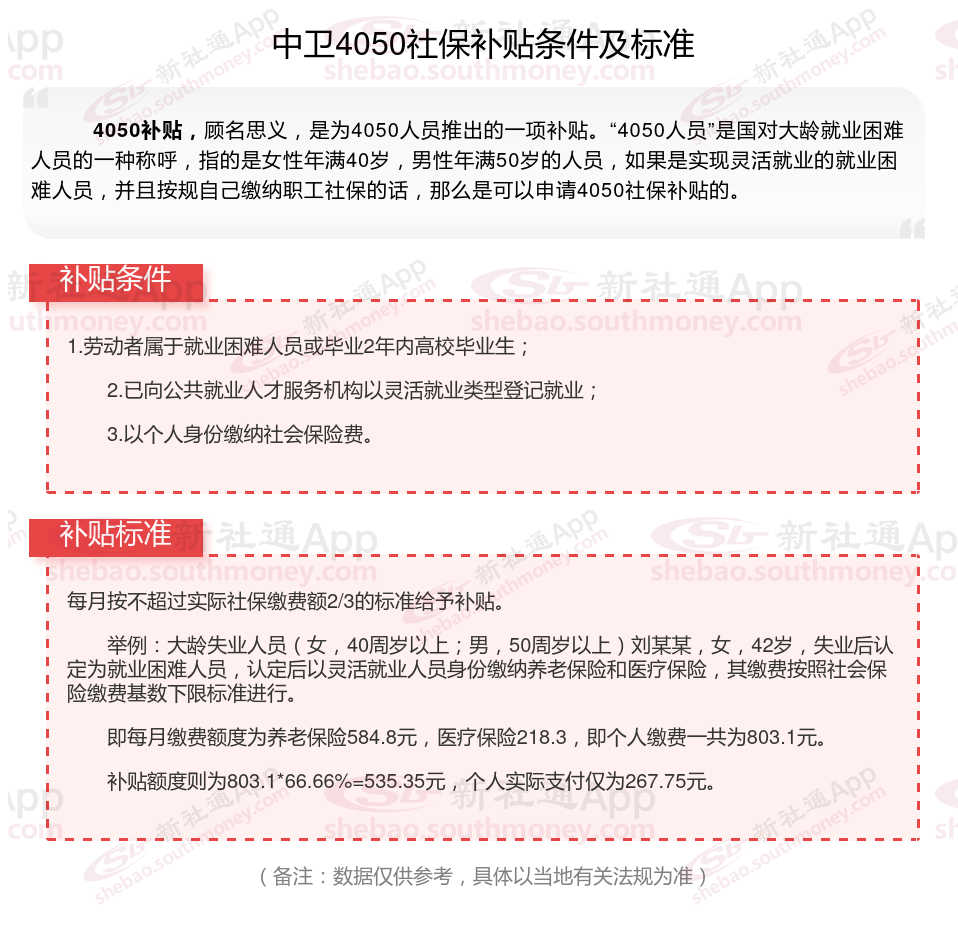 中卫4050灵活就业社保补贴是什么?今天聊一下4050补贴话题。44050社保补贴标准据新社通app小编了解,通常,4050社保补贴包含基本医疗保险和基本养老保险两个险种,社保补贴金额为申请人实际缴纳基本养老保险和基本医疗保险金额的2/3,具体标准以当地社保局公布的数据为准!那么中卫4050灵活就业社保补贴标准是多少钱?中卫4050社保补贴可以领取多少?接下来随新社通APP小编了解一下中卫4050灵活就业社保补贴的最新资讯。
