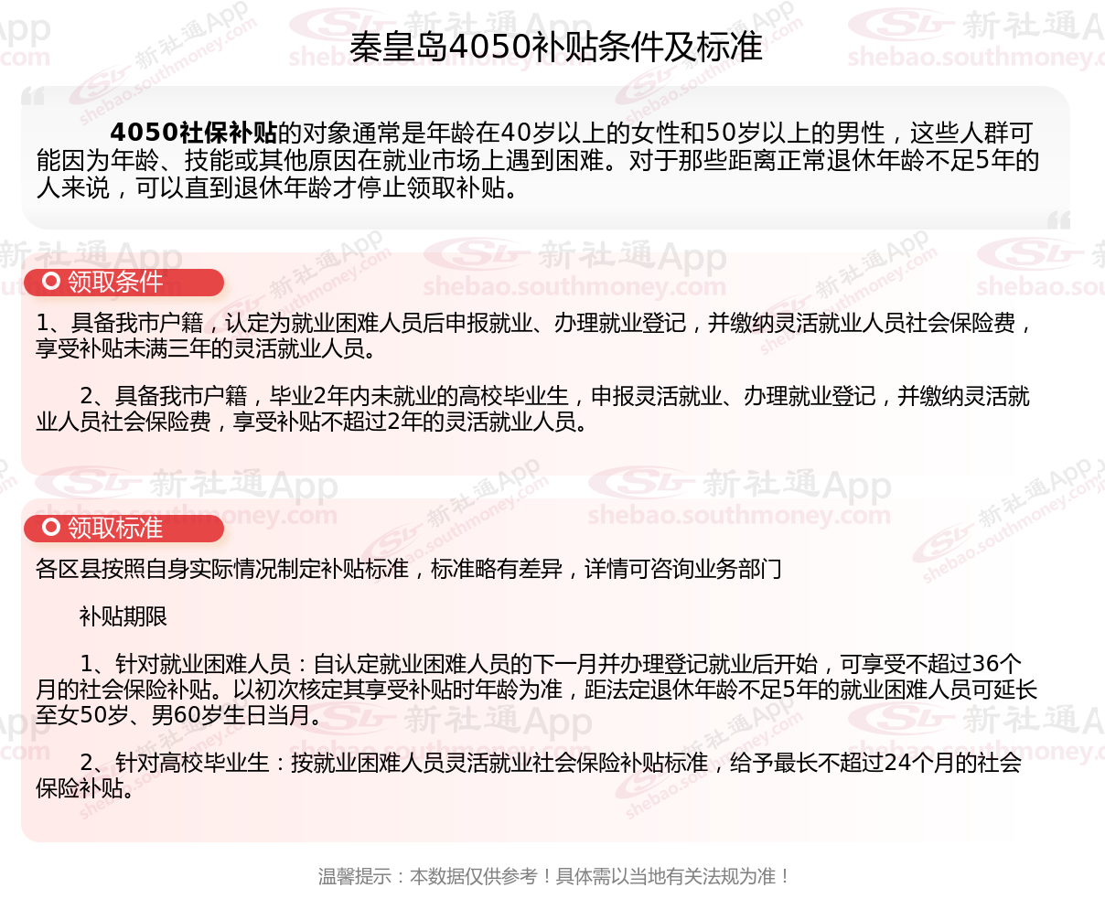 二、2025年秦皇岛4050社保补贴标准,最新领取条件来了