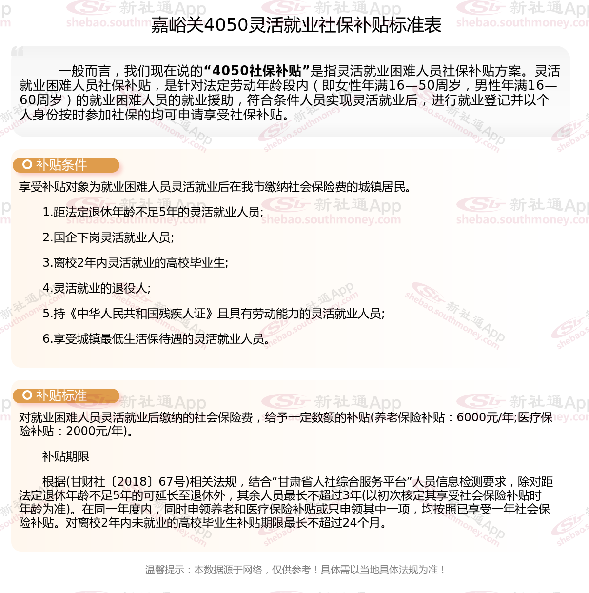 2025嘉峪关灵活就业4050社保补贴是一项面向特定年龄段的就业困难人群的社会保险补贴。