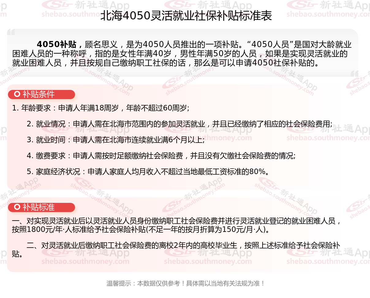 二、2025年北海灵活就业4050社保补贴标准及条件是什么
