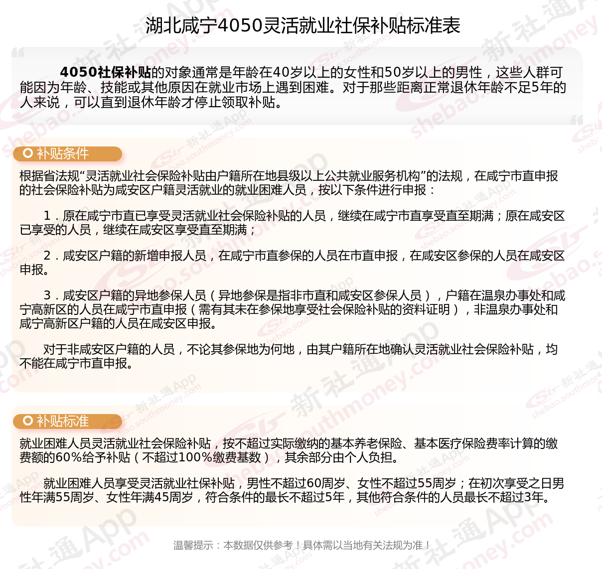 二、湖北咸宁灵活就业4050社保补贴标准及条件是什么