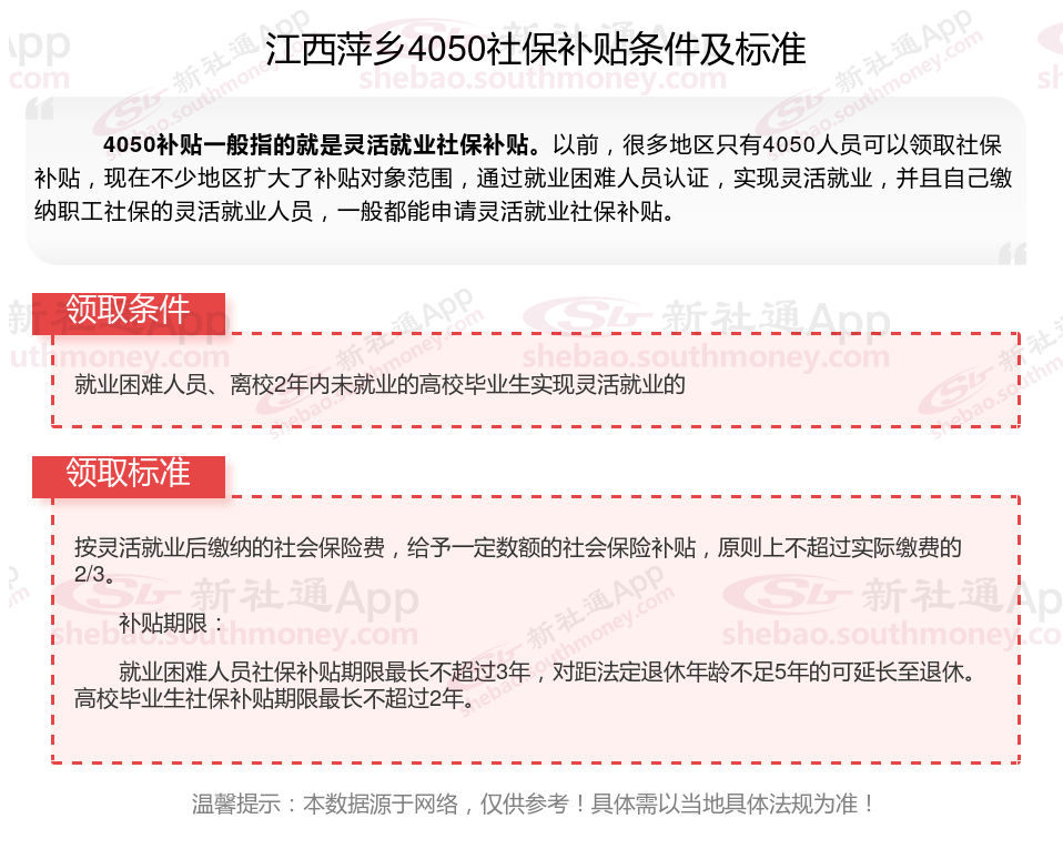 二、江西萍乡4050社保补贴标准及条件2025年最新消息