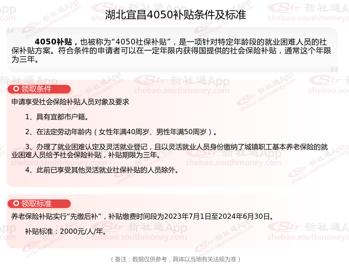 4050社保补贴标准据新社通app小编了解,通常,4050社保补贴包含基本医疗保险和基本养老保险两个险种,社保补贴金额为申请人实际缴纳基本养老保险和基本医疗保险金额的2/3,具体标准以当地社保局公布的数据为准!那么湖北宜昌灵活就业人员4050补贴最新标准是多少,湖北宜昌4050灵活就业人员社保补贴一年可以有多少钱?接下来随新社通APP小编具体了解一下4050社保补贴内容。