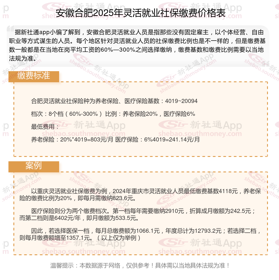 2025灵活就业社保缴费标准的调整,既体现了法规的连续性,又适应了经济社会发展的要求。灵活就业人员应根据自身情况,合理选择缴费基数和缴费比例,确保自身权益得到充分保证。那么2025年安徽合肥灵活就业人员社保需要交多少钱,你了解2025年安徽合肥灵活就业人员社保缴费基数及比例吗,接下来随新社通APP小编一起来看看。