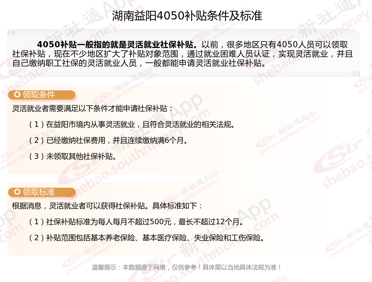 今天聊一下4050补贴话题。4050补贴听起来像是一个针对特定年龄人群的社保补贴。比如女性需年满40周岁,男性需年满50周岁(以申请当年12月31日为截止日期)。那么湖南益阳4050灵活就业社保补贴标准是多少钱?湖南益阳4050社保补贴条件是什么?接下来随新社通APP小编了解一下最新资讯。