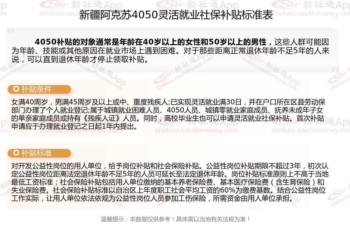 一、2023-2024年新疆阿克苏4050社保补贴标准及条件,最新如下