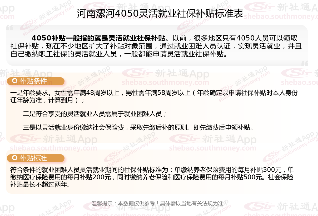 2025河南漯河灵活就业4050社保补贴是一项面向特定年龄段的就业困难人群的社会保险补贴。