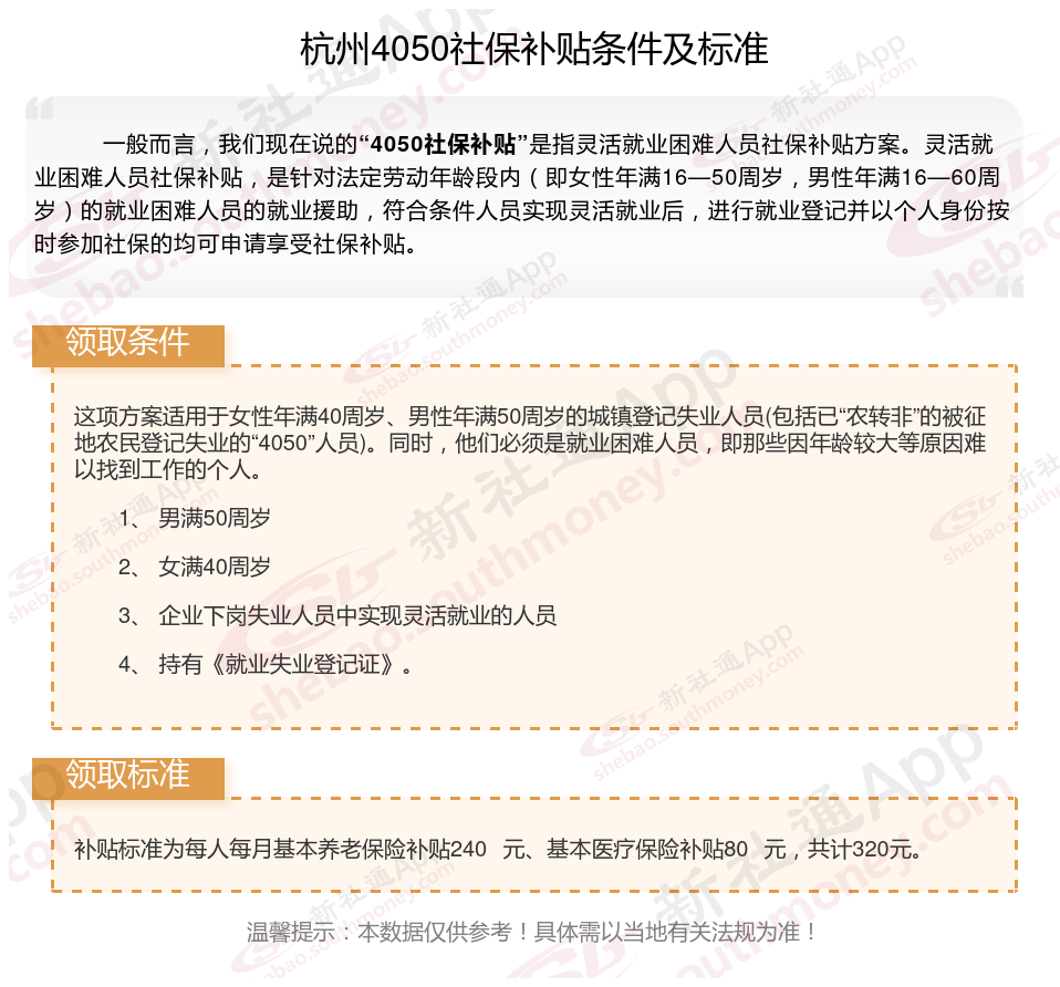 二、2025年杭州4050社保补贴标准及条件,最新如下: