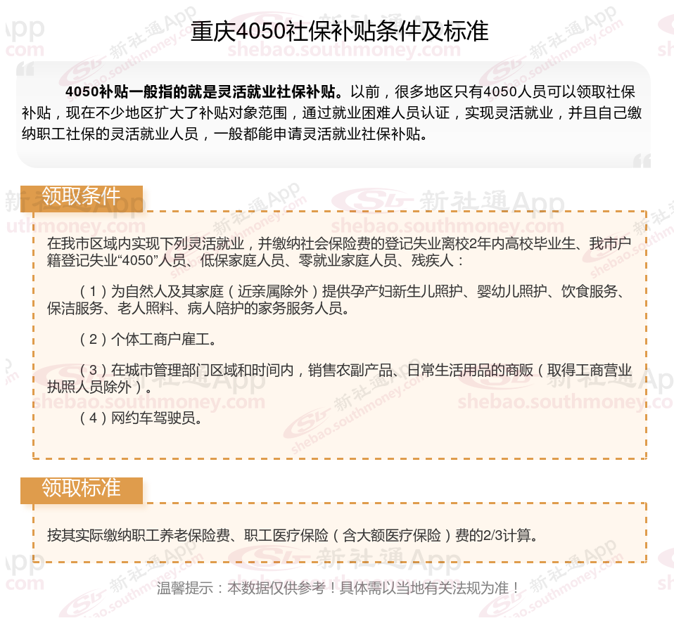 重庆4050灵活就业社保补贴是什么?今天聊一下4050补贴话题。44050社保补贴标准据新社通app小编了解,通常,4050社保补贴包含基本医疗保险和基本养老保险两个险种,社保补贴金额为申请人实际缴纳基本养老保险和基本医疗保险金额的2/3,具体标准以当地社保局公布的数据为准!那么重庆4050灵活就业社保补贴标准是多少钱?重庆4050社保补贴可以领取多少?接下来随新社通APP小编了解一下重庆4050灵活就业社保补贴的最新资讯。