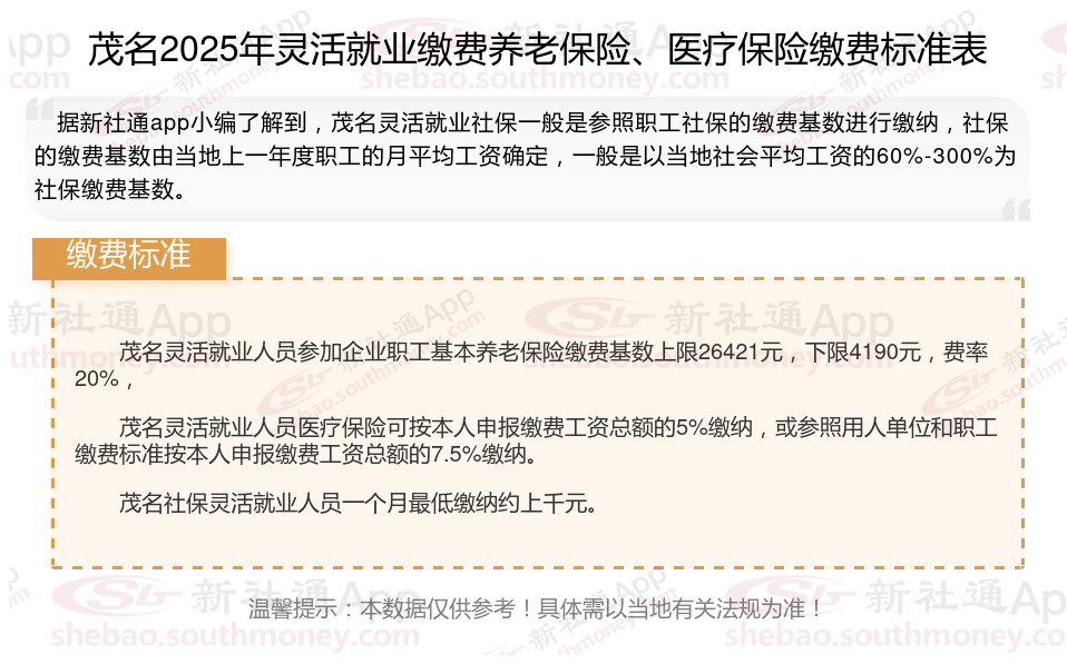 一、2025年茂名灵活就业人员社保养老+医保缴费标准一年多少钱?