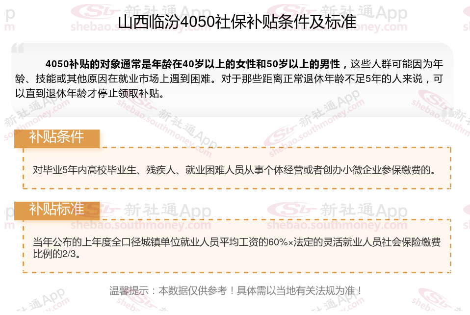 一、山西临汾4050社保补贴标准及条件2025年最新消息
