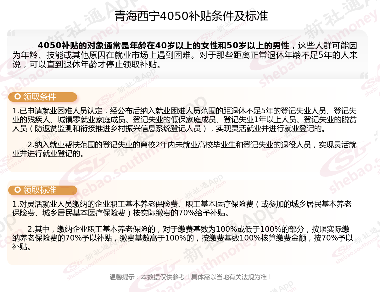 一、2025年青海西宁4050社保补贴新规2025年青海西宁4050社保补贴标准是什么,需要什么条件?