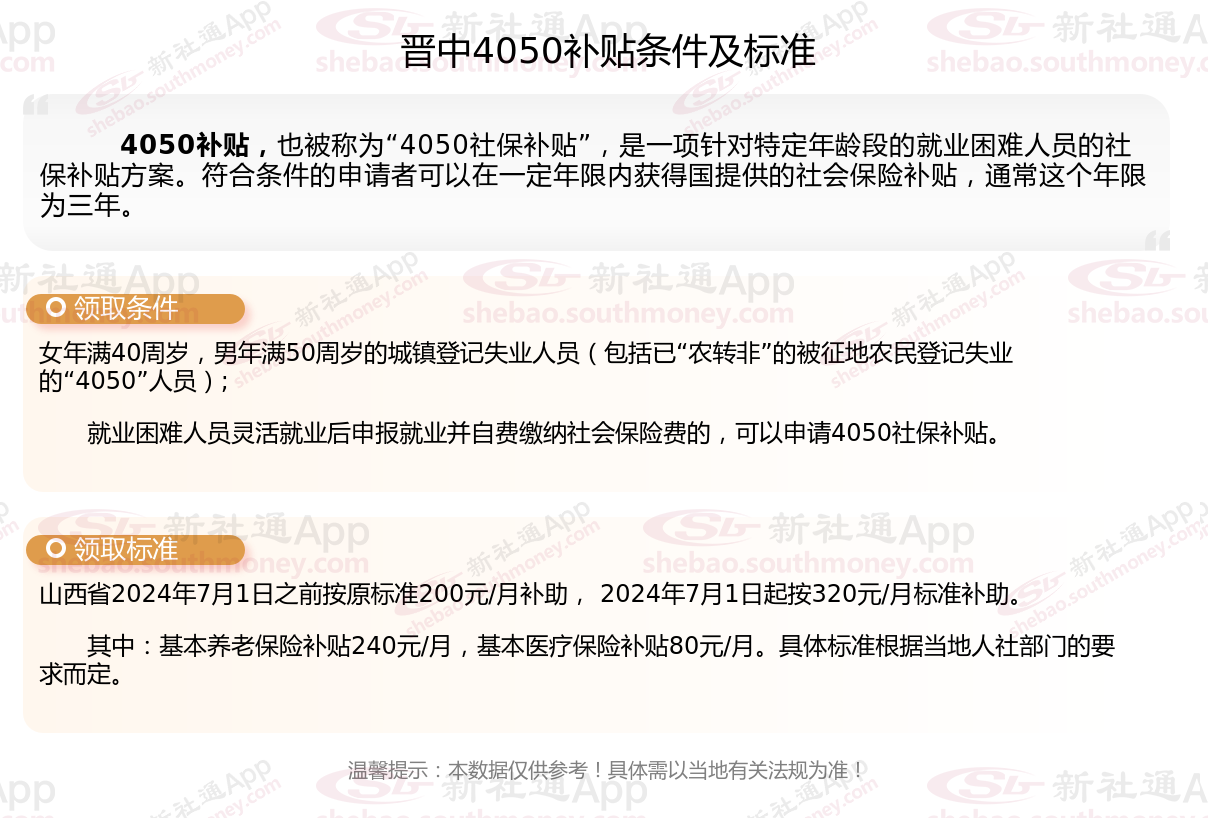 2025晋中4050补贴主要针对的是年龄在40岁以上的女性和50岁以上的男性,这些人群通常因为年龄较大而面临就业困难。