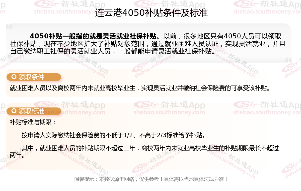 二、2025年连云港4050社保补贴标准及条件,最新如下: