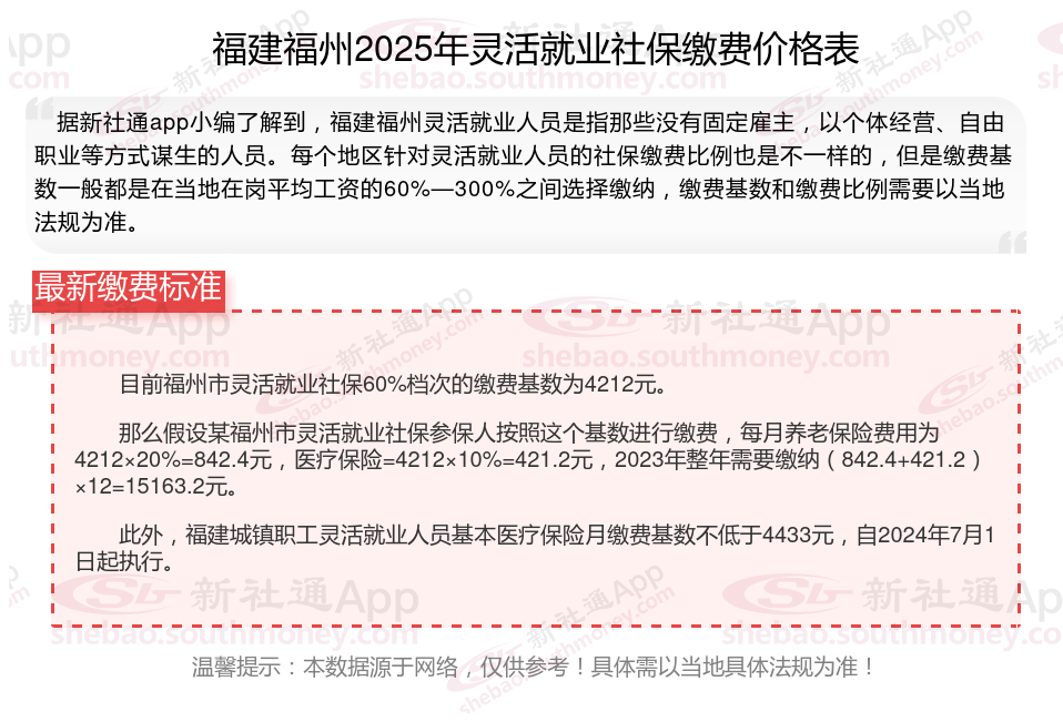 随着经济社会的不断发展,灵活就业群体不断地日益壮大,其社保缴费问题也愈发受到关注。那么2025年福建福州灵活就业人员社保交多少钱,你了解2025年福建福州灵活就业人员社保缴费基数及比例吗,接下来随新社通APP小编一起来看看。