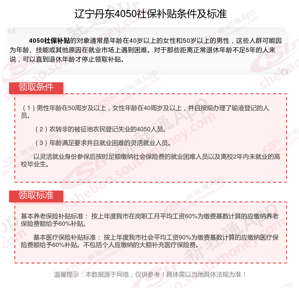 二、2025年辽宁丹东4050社保补贴标准及条件,最新如下: