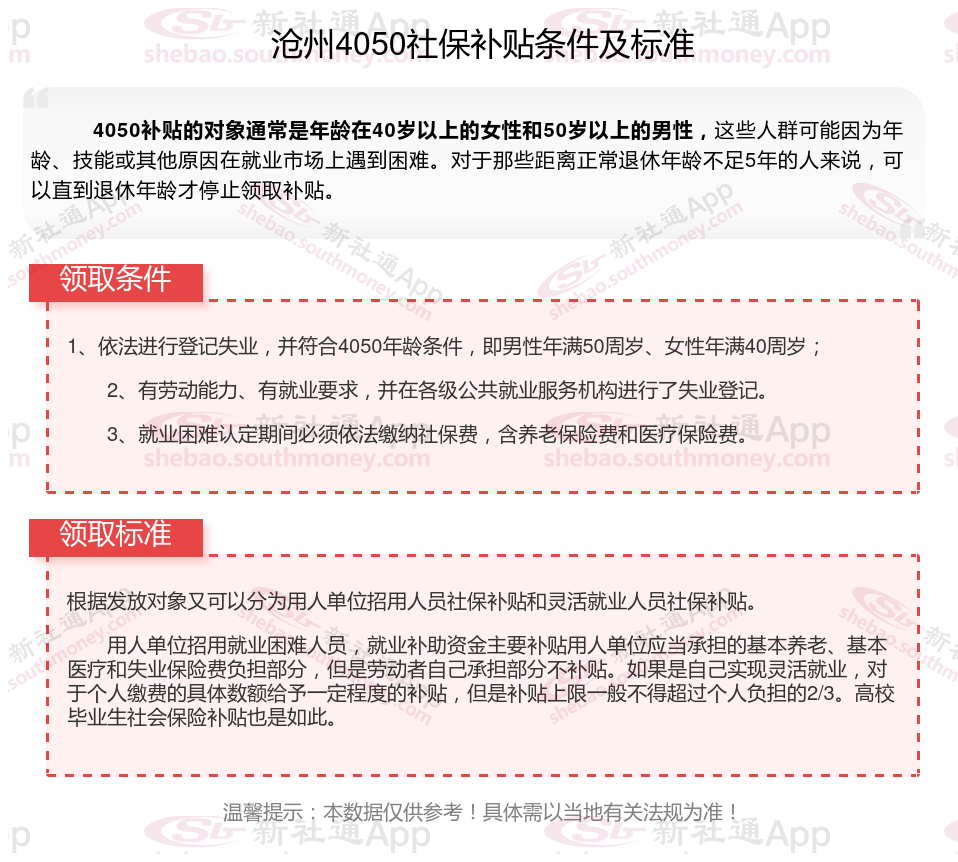 2025沧州4050补贴主要针对的是年龄在40岁以上的女性和50岁以上的男性,这些人群通常因为年龄较大而面临就业困难。