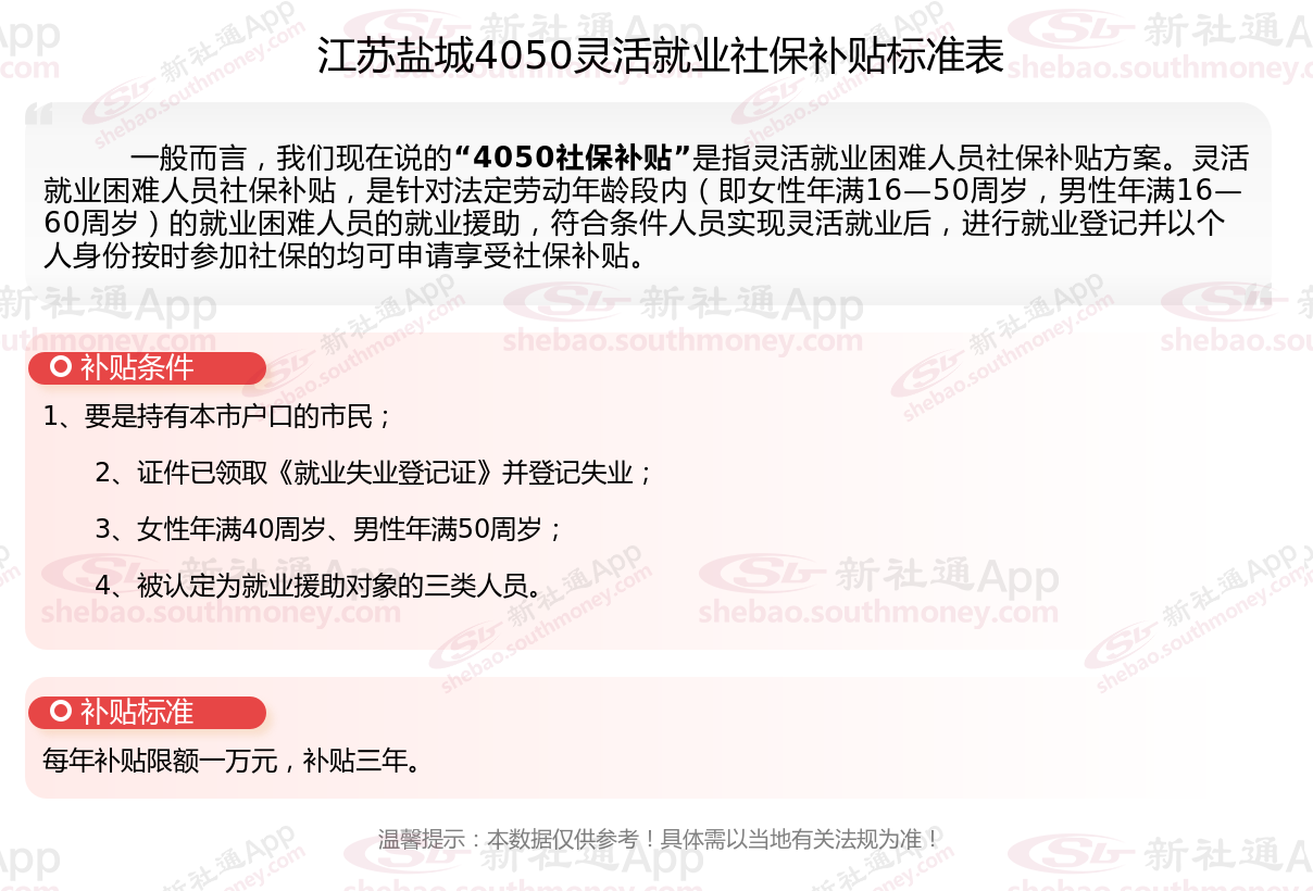 二、2025年江苏盐城4050社保补贴标准及条件,最新如下: