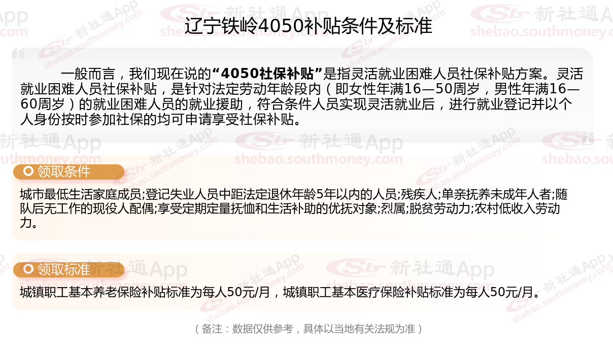 一、辽宁铁岭4050社保补贴标准及条件2025年最新消息