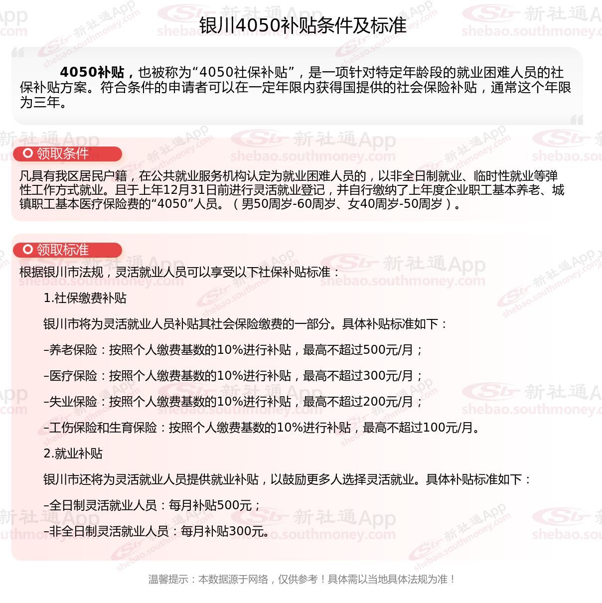 今天聊一下4050补贴话题。4050补贴听起来像是一个针对特定年龄人群的社保补贴。比如女性需年满40周岁,男性需年满50周岁(以申请当年12月31日为截止日期)。那么银川4050灵活就业社保补贴标准是多少钱?银川4050社保补贴条件是什么?接下来随新社通APP小编了解一下最新资讯。