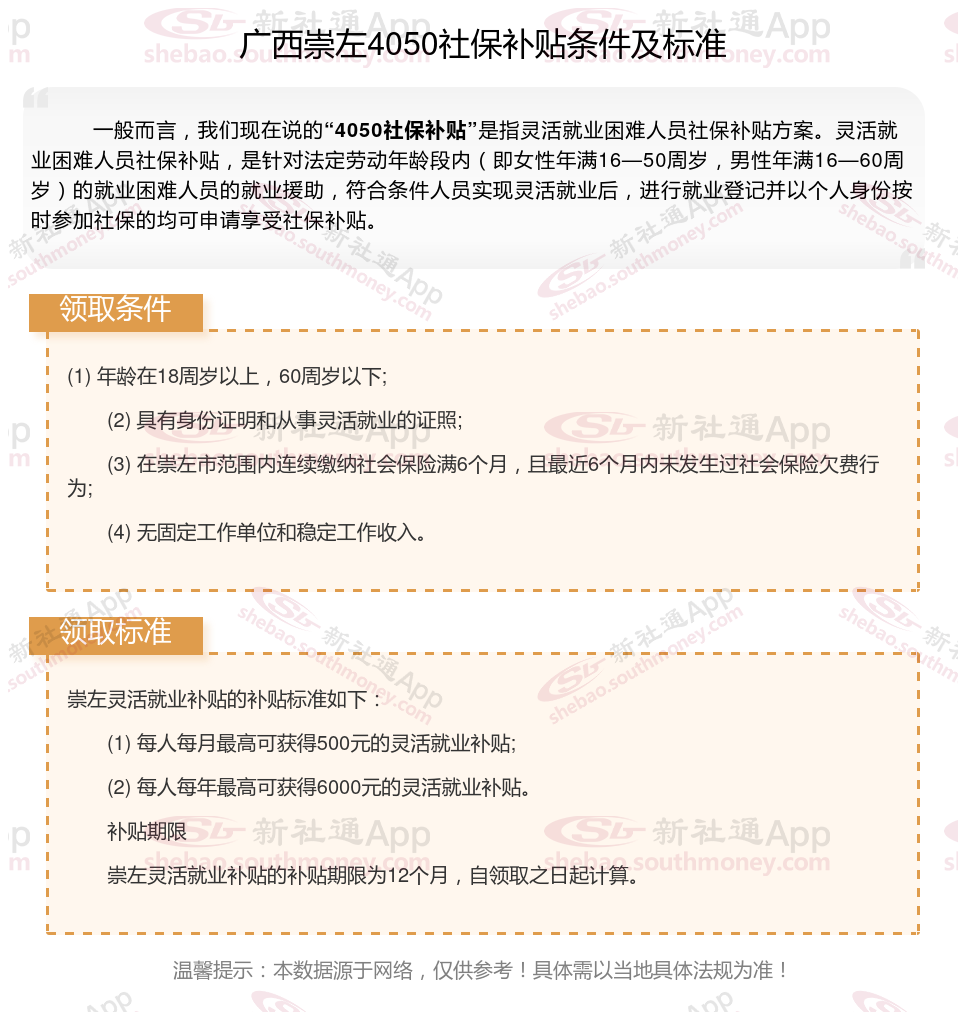 4050补贴主要是针对大龄就业困难人群的社保补贴,申请条件包括年龄、就业困难、灵活就业并自费缴纳社保,需要持有失业登记证,不同地区可能有细微差别,比如农村户口的限制。那么广西崇左4050灵活就业社保补贴标准是多少钱?广西崇左4050社保补贴条件是什么?接下来随新社通APP小编了解一下最新资讯。