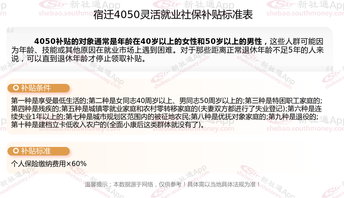 二、2025年宿迁4050社保补贴标准及条件,最新如下: