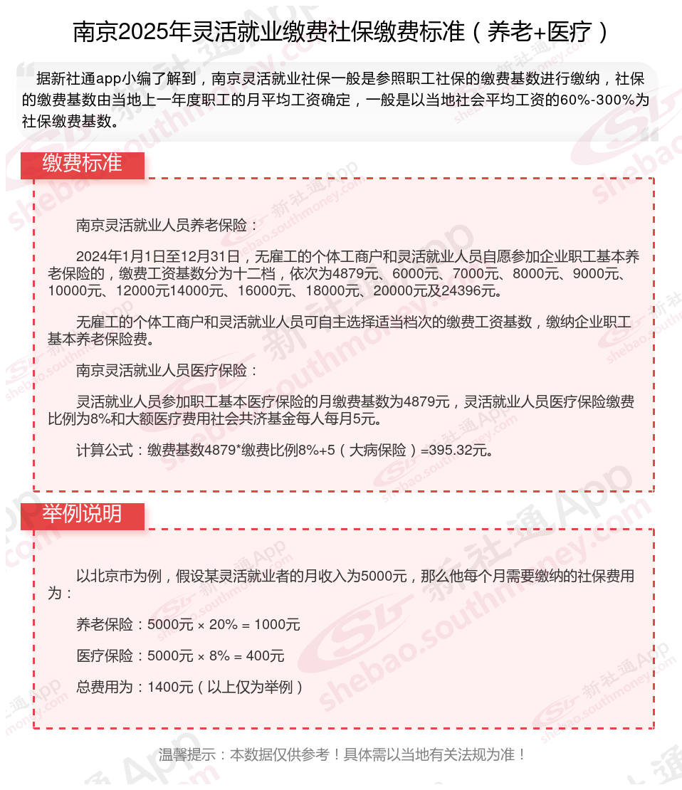 据新社通app数据显示,南京灵活就业养老保险最低缴费基数为:4494元;个人的缴费比例分别为:20%;