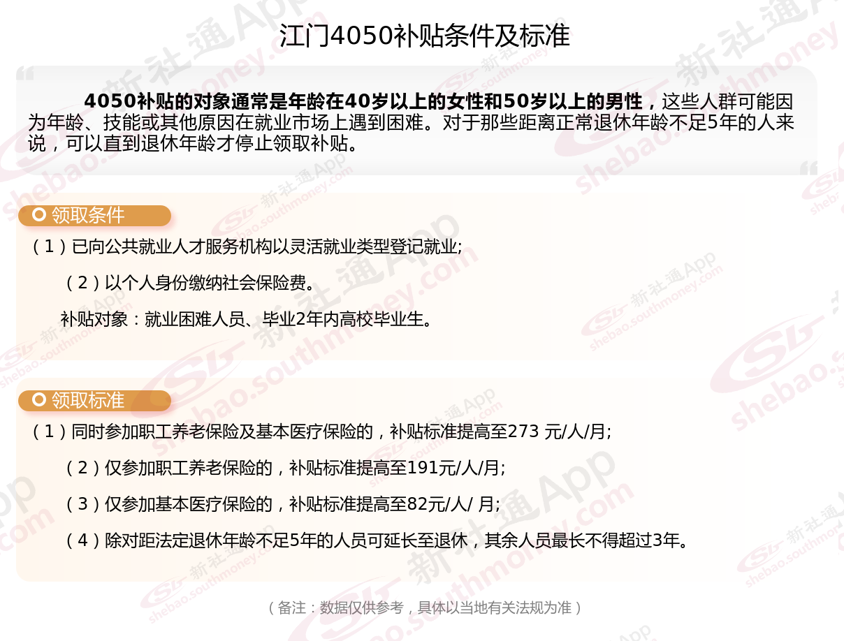 今天聊一下4050补贴的相关内容。4050补贴听起来像是一个针对特定年龄人群的社保补贴。比如女性需年满40周岁,男性需年满50周岁(以申请当年12月31日为截止日期)。那么江门4050灵活就业困难人员社保补贴多少钱?江门4050社保补贴可以申请吗?接下来随新社通APP小编具体了解一下4050社保补贴内容。