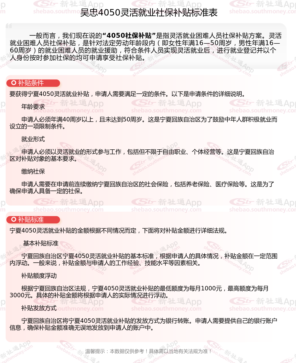 一、2025年吴忠灵活就业4050社保补贴标准是多少?申请条件是什么?