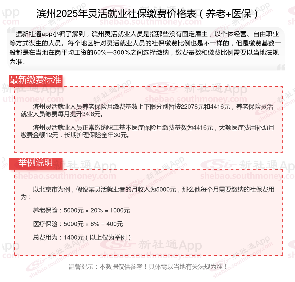 据新社通app数据显示,滨州灵活就业养老保险的缴费基数为:4416元。灵活就业人员参保缴费的比例为个人20%。