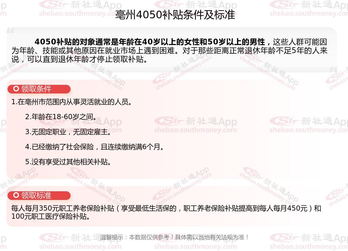 一、2025年亳州4050社保补贴标准及条件是多少?