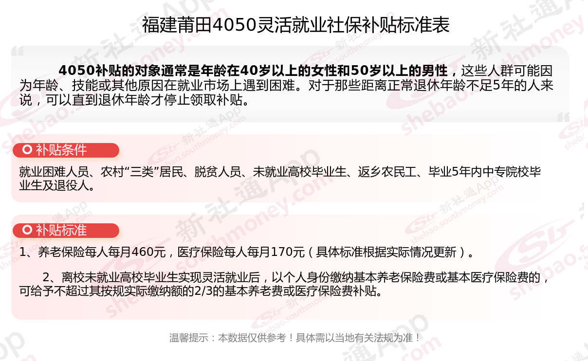 2025福建莆田4050补贴主要针对的是年龄在40岁以上的女性和50岁以上的男性,这些人群通常因为年龄较大而面临就业困难。