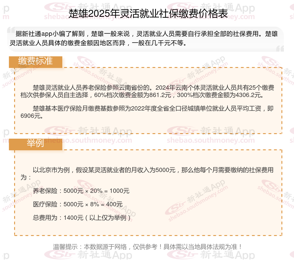 据新社通app数据显示,楚雄灵活就业养老保险的缴费基数为:4306.2元。灵活就业人员参保缴费的比例为个人20%。