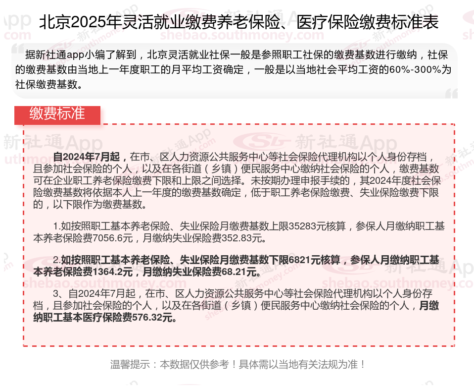 据新社通app数据显示,北京灵活就业养老保险的缴费基数为:6821元。灵活就业人员参保缴费的比例为个人20%。