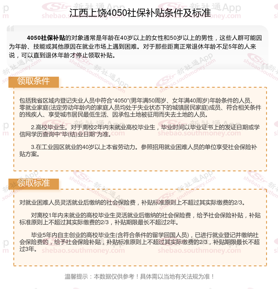 二、2025年江西上饶4050社保补贴标准及条件,最新如下: