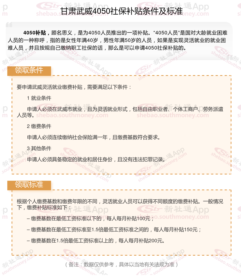 2025甘肃武威灵活就业4050社保补贴是一项面向特定年龄段的就业困难人群的社会保险补贴。