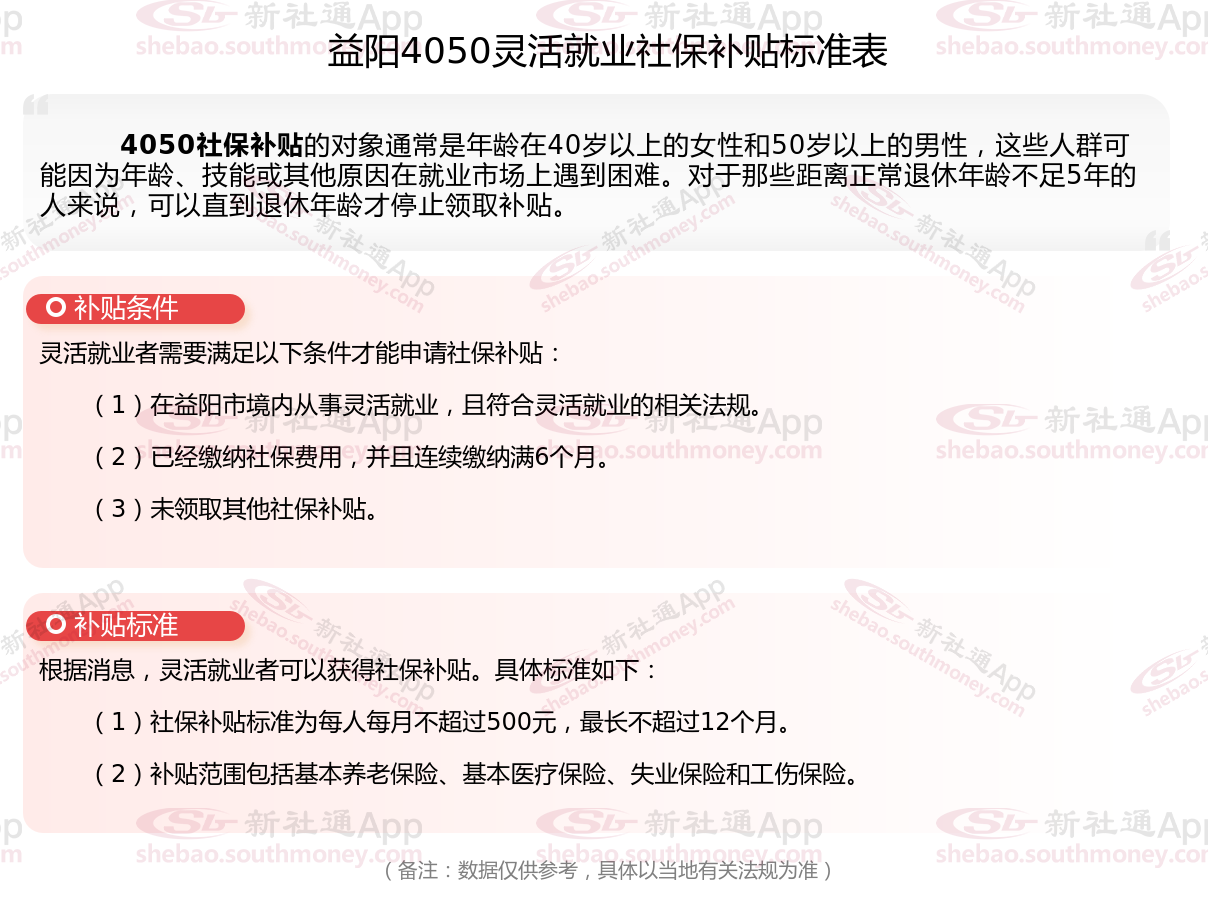 今天聊一下4050补贴话题。4050补贴听起来像是一个针对特定年龄人群的社保补贴。比如女性需年满40周岁,男性需年满50周岁(以申请当年12月31日为截止日期)。那么益阳4050灵活就业社保补贴标准是多少钱?益阳4050社保补贴条件是什么?接下来随新社通APP小编了解一下最新资讯。