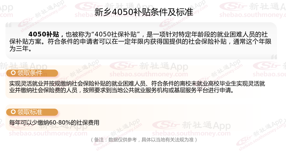 一、2025年新乡4050社保补贴标准及条件是多少?