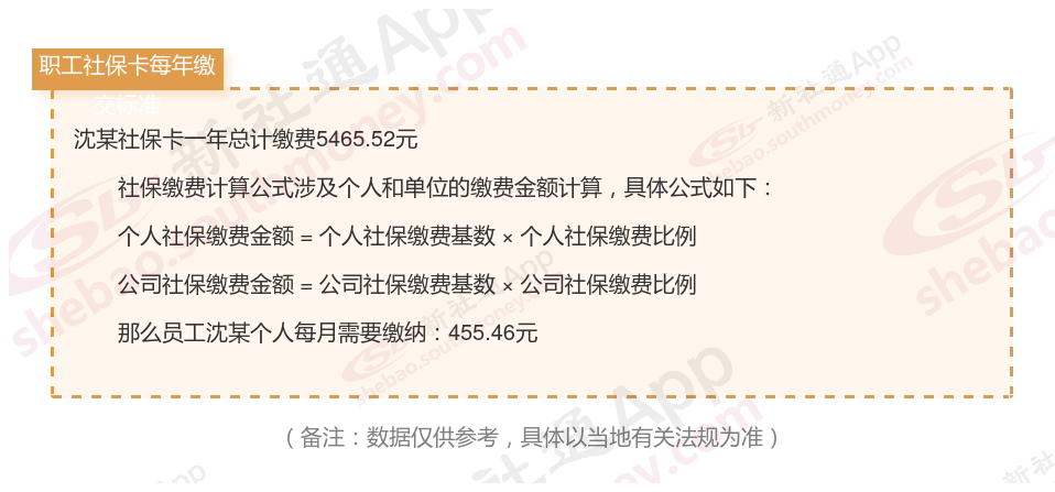 由上图得知,沈某社保卡一年需要缴纳5465.52元,个人部分每月需要缴纳455.46元,若您想要了解明细点击新社通社保计算器,来了解一下明细吧。