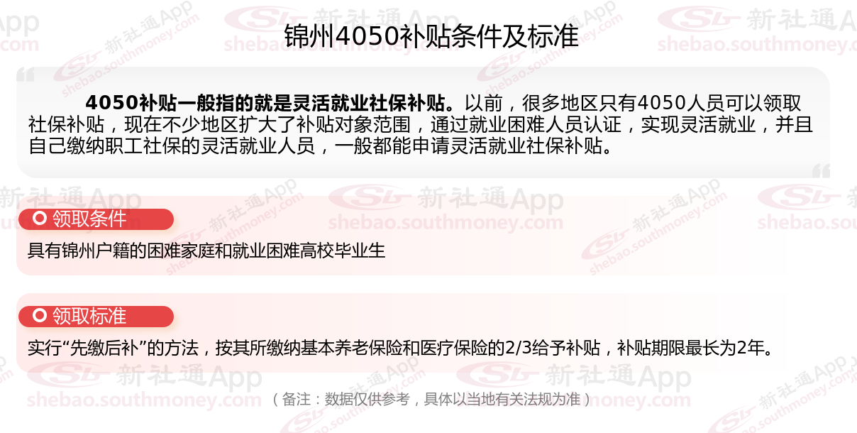 2025锦州4050补贴主要针对的是年龄在40岁以上的女性和50岁以上的男性,这些人群通常因为年龄较大而面临就业困难。